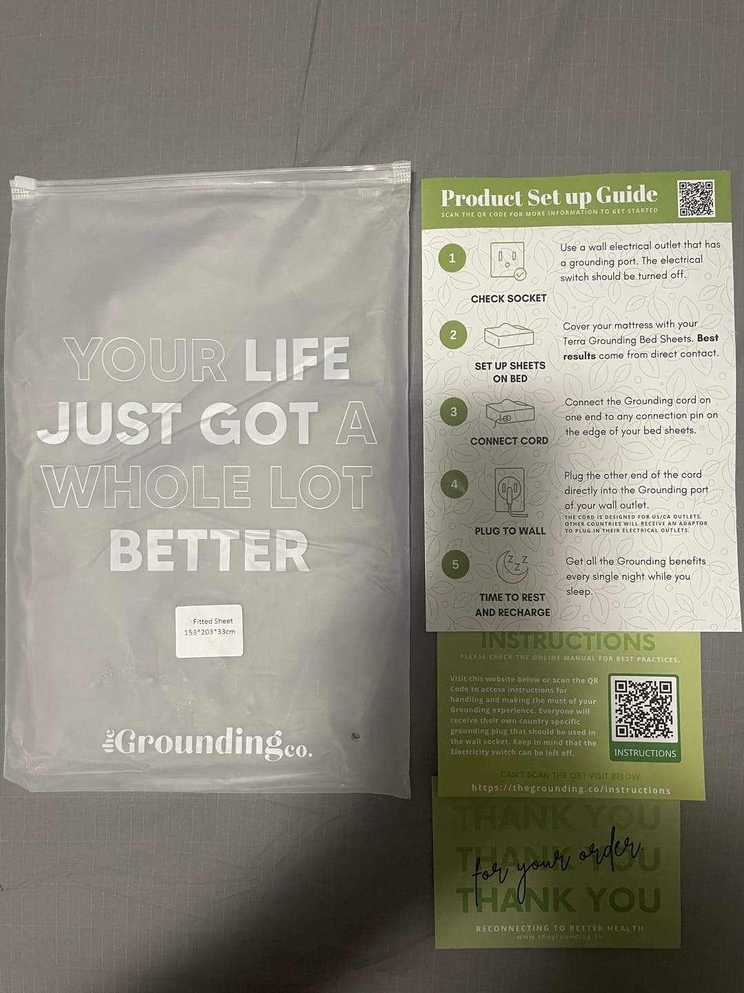 You plug a simple cord into the grounding port of any standard outlet (the round hole, not the electrical ones), connect it to the sheet, and that’s it.